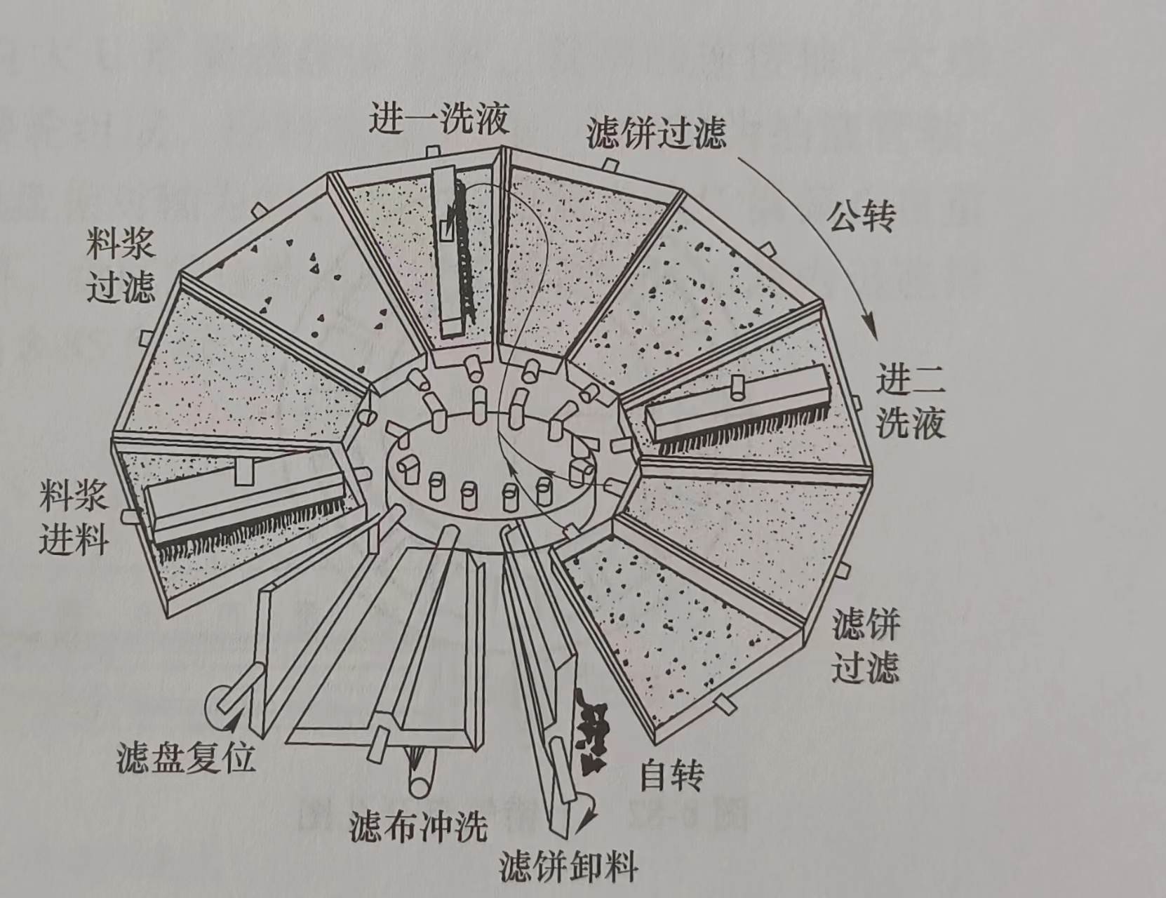 將翻盤(pán)真空過(guò)濾機(jī)展開(kāi)成平面圖形,通過(guò)展開(kāi)的平面原理圖可以更醒目地了解其工作原理:過(guò)濾機(jī)的每個(gè)濾盤(pán)小端部都通過(guò)吸酸膠管與中心分配頭的上錯(cuò)氣盤(pán)各孔——對(duì)應(yīng)相通,并與之同步水平回轉(zhuǎn)