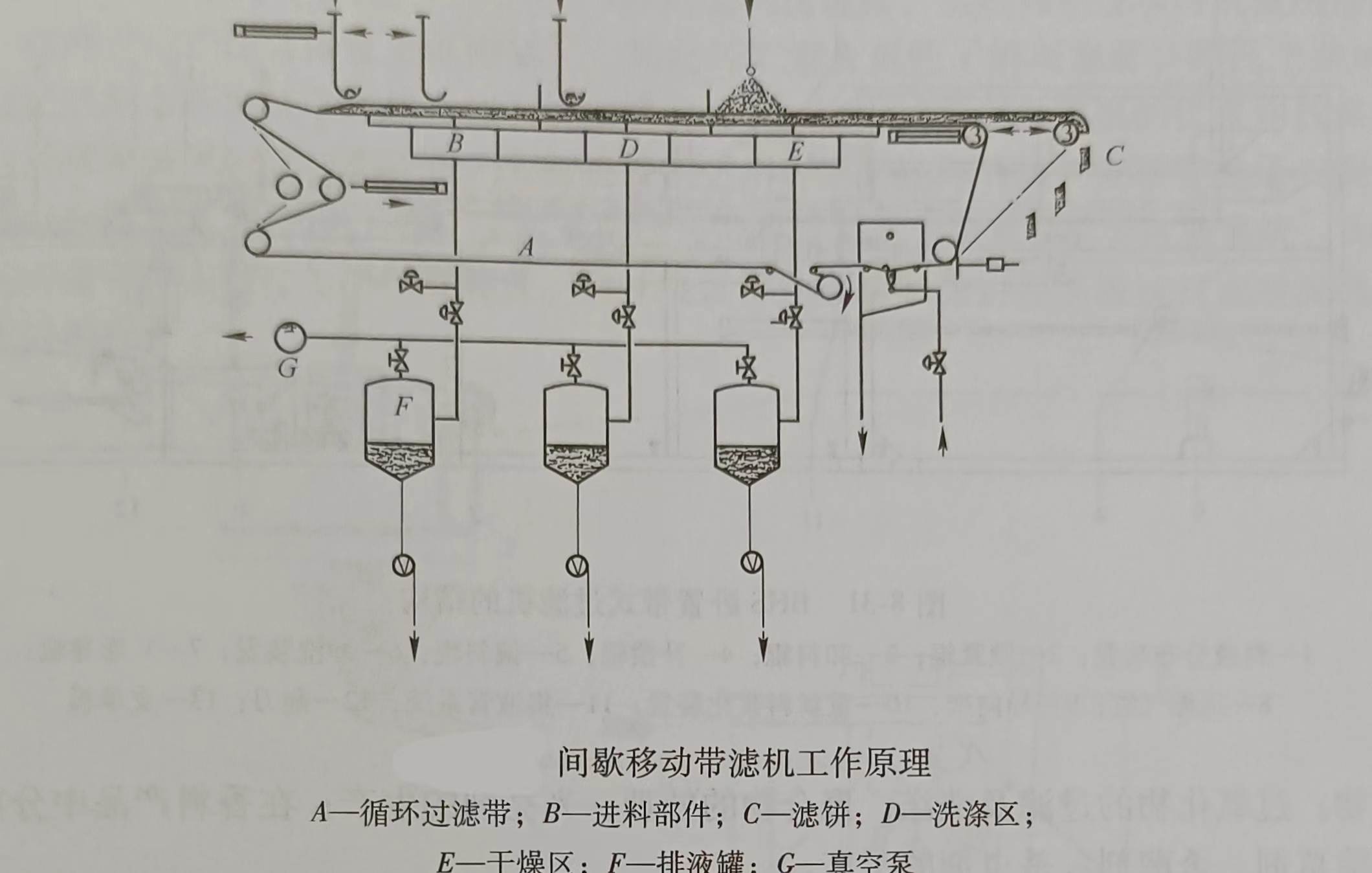 固定室?guī)秸婵者^(guò)濾機(jī)的工作原理首先料漿經(jīng)進(jìn)料裝置均勻分布到移動(dòng)的濾帶上.料漿在真空的作用下進(jìn)行過(guò)濾,抽濾后形成的濾餅向前行進(jìn)接受洗滌.