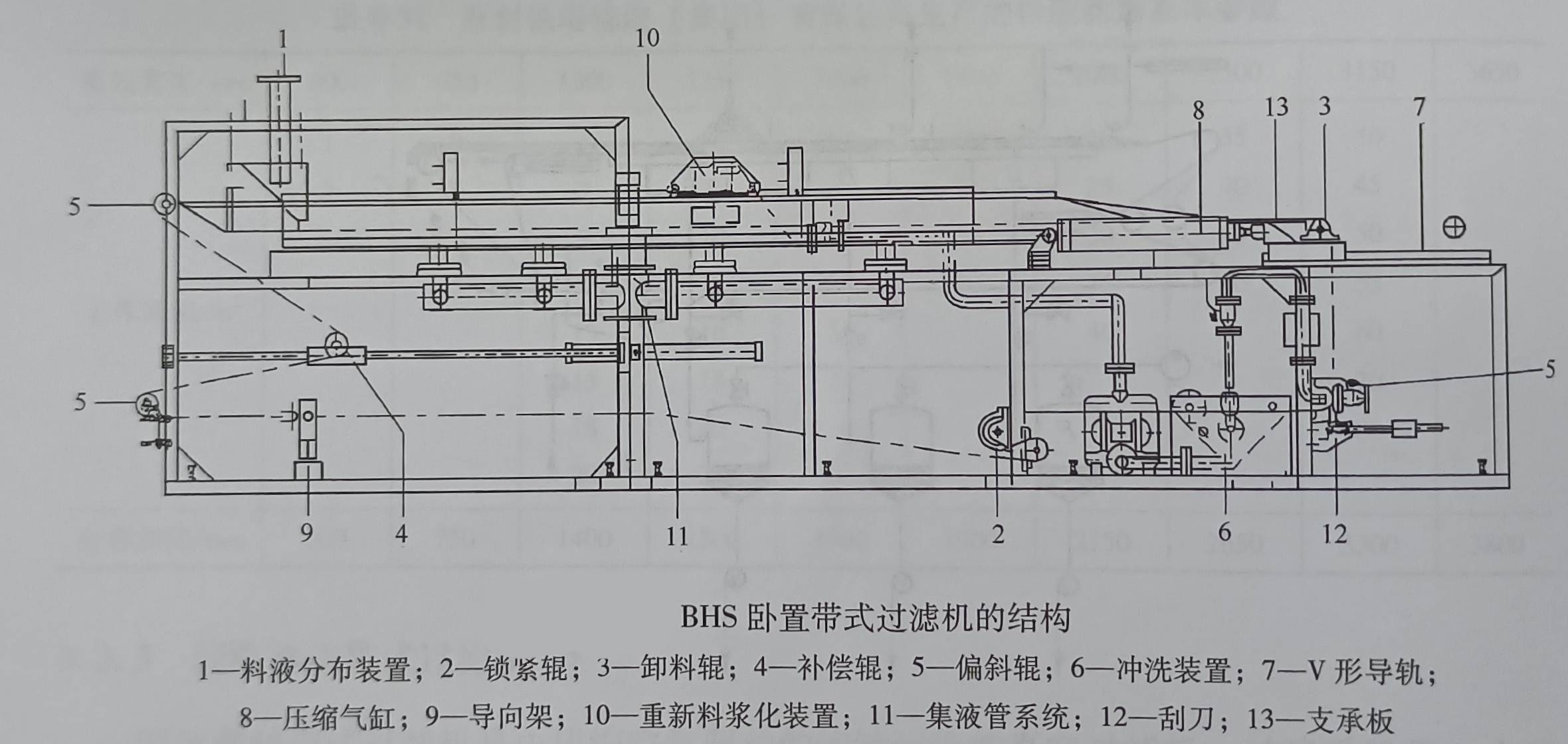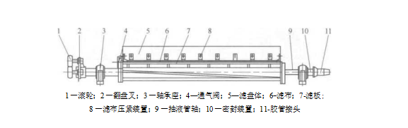 固定室?guī)秸婵者^(guò)濾機(jī)主要由橡膠濾袋,真空箱,驅(qū)動(dòng)輥,從動(dòng)輥,進(jìn)料槽,濾布調(diào)偏裝置,濾布張緊裝置,驅(qū)動(dòng)裝置,洗滌裝置和機(jī)架等部件組成.